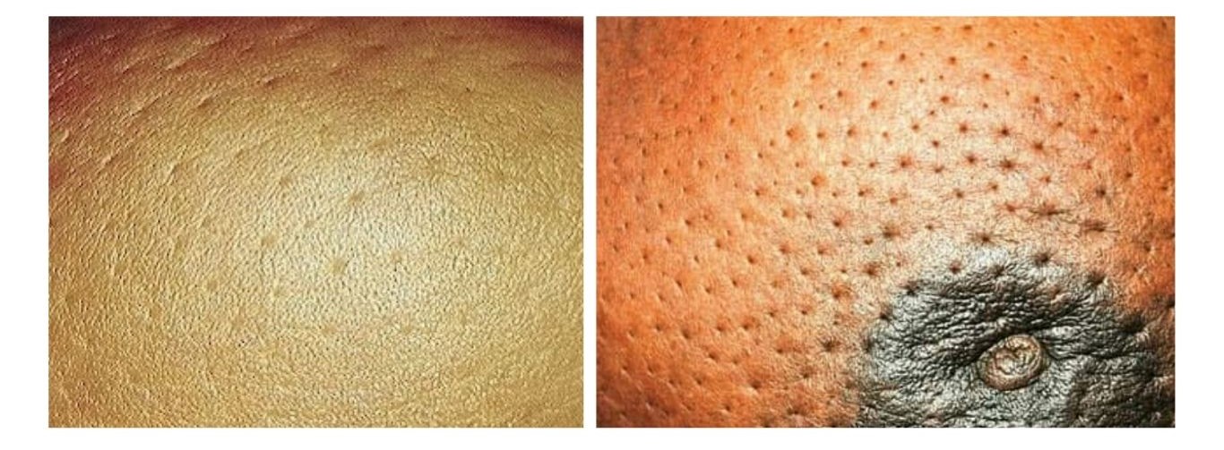 Stav, kdy kůže prsu zduří, zhrubne a má jemné dolíčky jako slupka pomeranče. Důvodem je ucpání drobných lymfatických cév v kůži nádorem – lymfa neodtéká, vzniká otok a povrch se místy vtahuje. Typicky se objevuje při zánětlivém karcinomu prsu, ale podobně může vypadat i lymfedém po operaci nebo výrazný zánět.