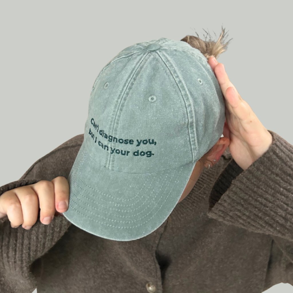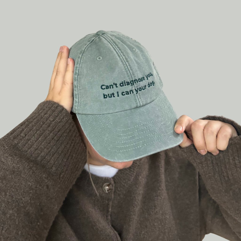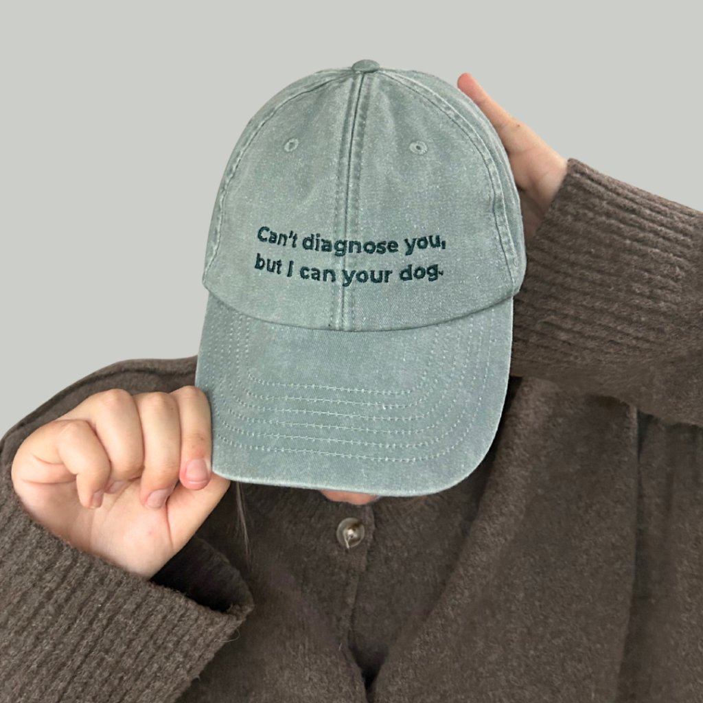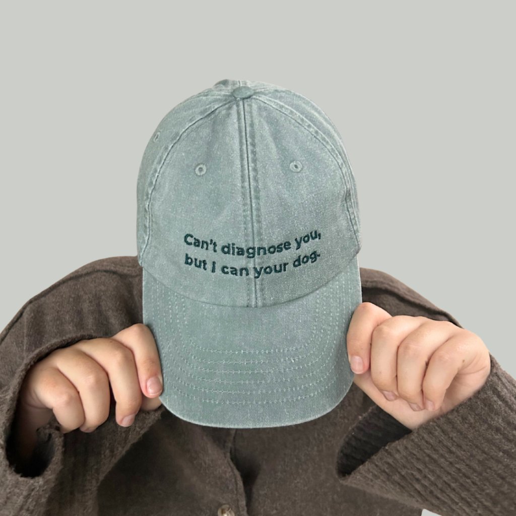 Zelená kšiltovka Cant Diagnose You But I Can Your Dog je veterinární kšiltovka navržená pro studenty veteriny a všechny, kteří se věnují péči o zvířata. Díky minimalistickému designu se hodí na praxi, přednášky, stáže i na každodenní.