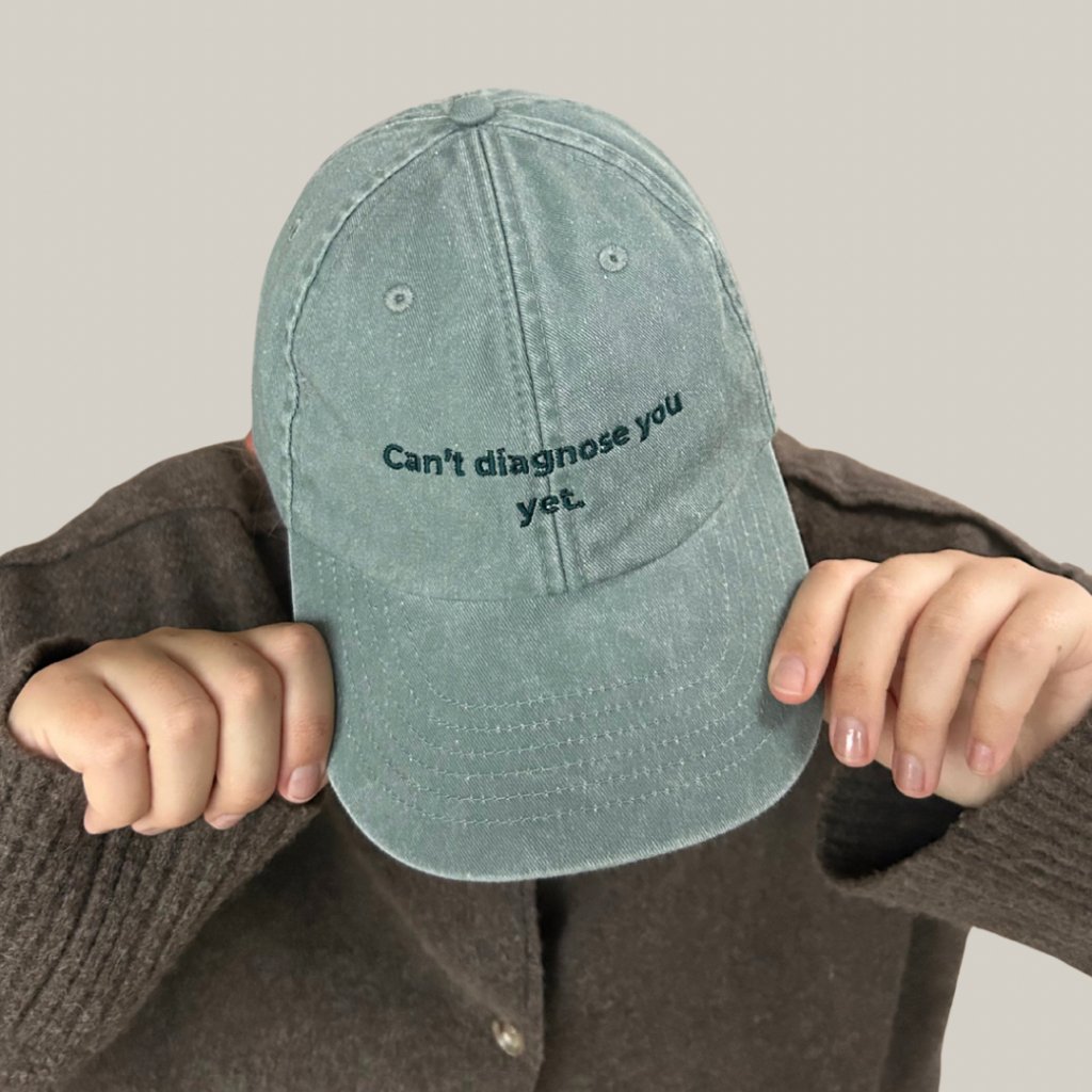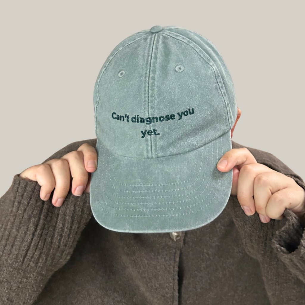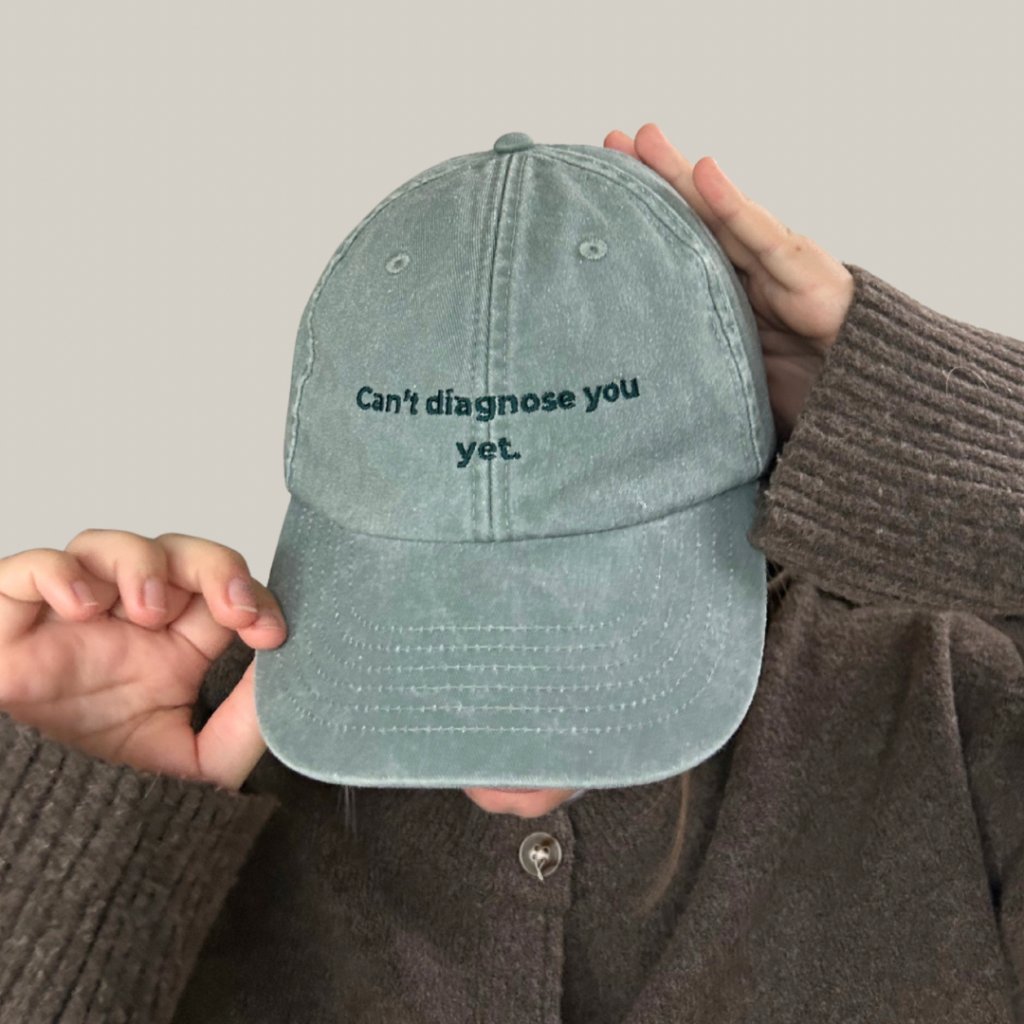 Zielona czapka Cant Diagnose You Yet to czepek medyczny przeznaczony dla studentów medycyny i studentów wszystkich kierunków medycznych. Dzięki minimalistycznemu wzornictwu nadaje się na staże, praktyki, wykłady i do noszenia na co dzień.
