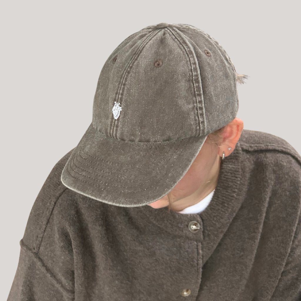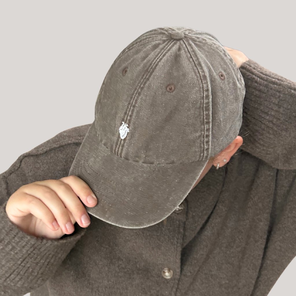 Brązowa czapka vintage z białym, anatomicznym haftem w kształcie serca. Minimalistyczny, unisexowy dodatek wykonany z szczotkowanej bawełny z wykończeniem acid wash, który idealnie leży i uzupełni strój studentów medycyny, lekarzy i miłośników anatomii.