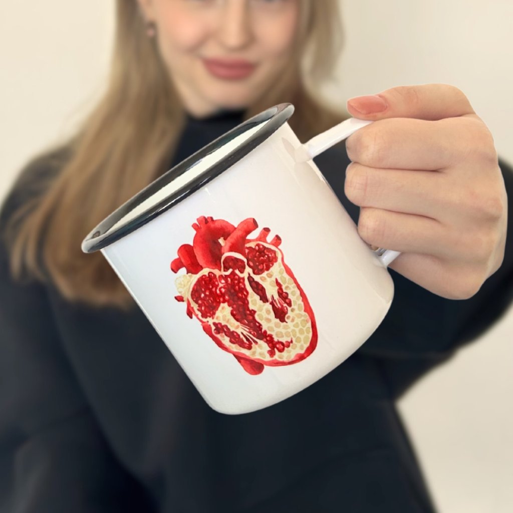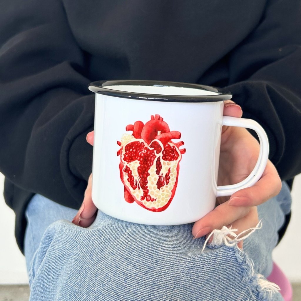 Emaliowana puszka o pojemności 500 ml z motywem serca w kształcie granatu.