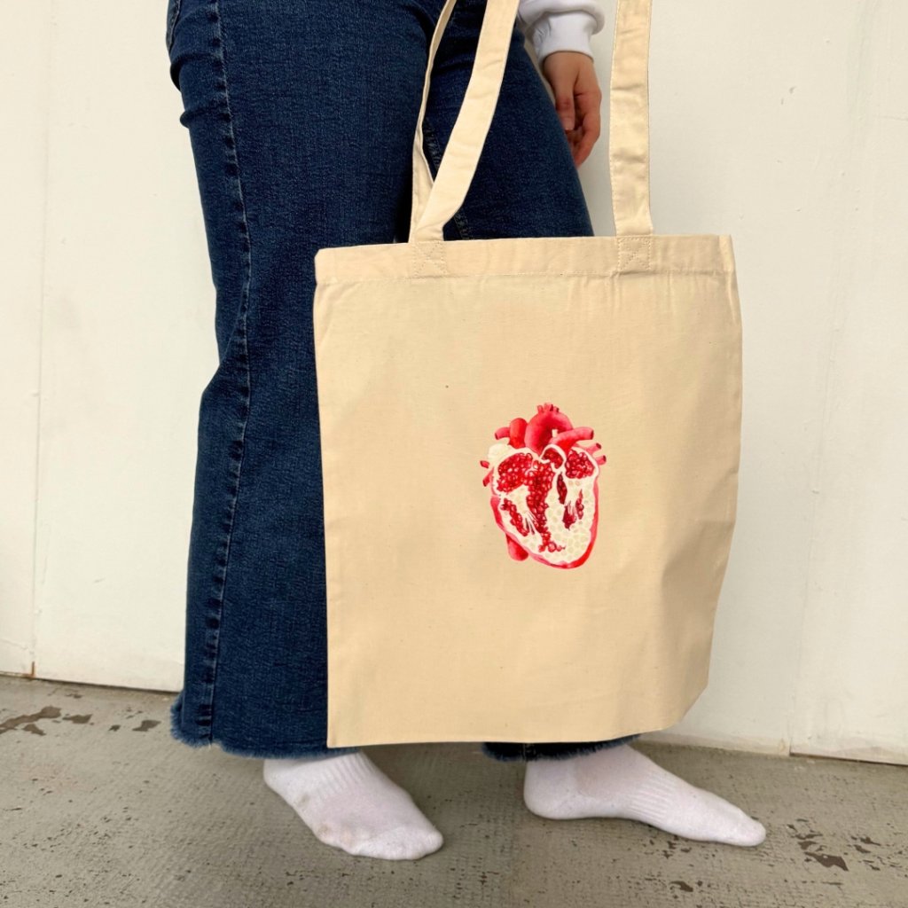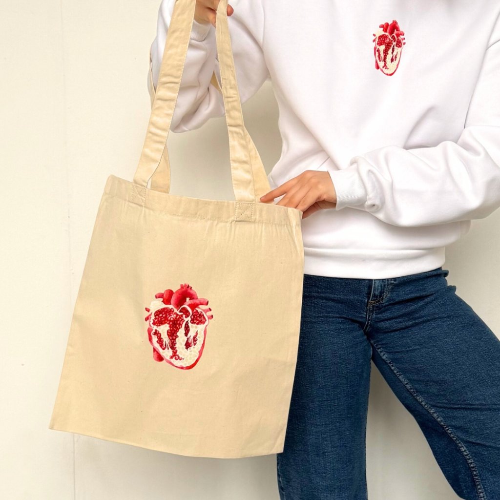Płócienna torba Pomegranate Heart w kolorze naturalnym wykonana jest ze 100% bawełny o mocnym splocie płóciennym (200 g/m²). Dzięki haftowi krzyżykowemu pasków jest wytrzymała i z łatwością pomieści nawet cięższe podręczniki czy zakupy. Jej wymiary (38 × 42 cm) i długie uchwyty (67 cm) pozwalają na wygodne noszenie jej w dłoni lub na ramieniu. Każdy egzemplarz drukujemy bezpośrednio w naszej pracowni z najwyższą starannością i miłością.
