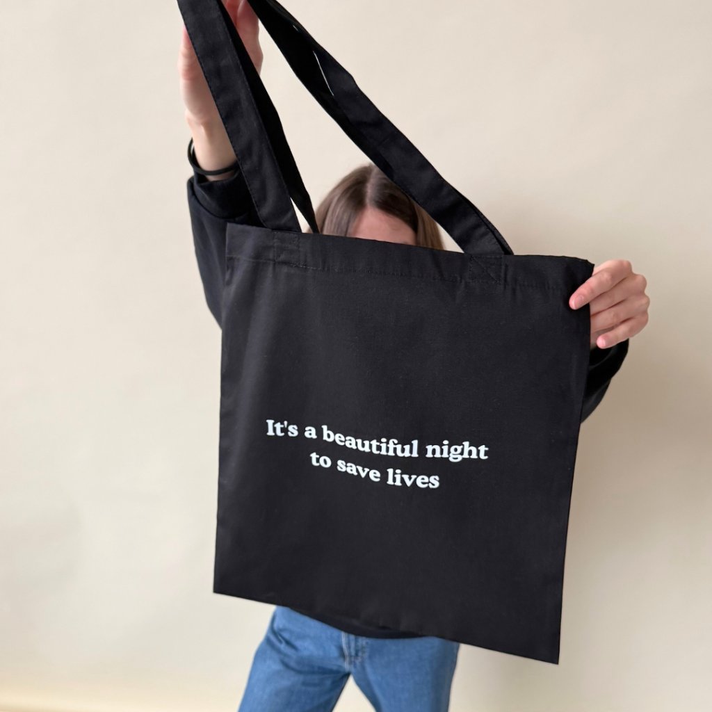 Plátěná taška It's a beautiful night to save lives v černé barvě je vyrobená ze 100% bavlny v pevné plátnové vazbě (200 g/m²). Díky křížovému prošití popruhů je odolná a bez problémů unese i těžší učebnice nebo nákup. Svými rozměry (38 × 42 cm) a dlouhými uchy (67 cm) umožňuje pohodlné nošení v ruce i přes rameno. Každý kousek potiskujeme přímo v naší dílně s maximální péčí a láskou.