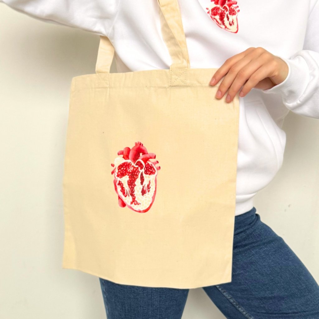 Plátěná taška Pomegranate heart v natural barvě je vyrobená ze 100% bavlny v pevné plátnové vazbě (200 g/m²). Díky křížovému prošití popruhů je odolná a bez problémů unese i těžší učebnice nebo nákup. Svými rozměry (38 × 42 cm) a dlouhými uchy (67 cm) umožňuje pohodlné nošení v ruce i přes rameno. Každý kousek potiskujeme přímo v naší dílně s maximální péčí a láskou.