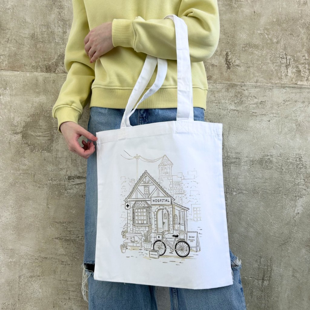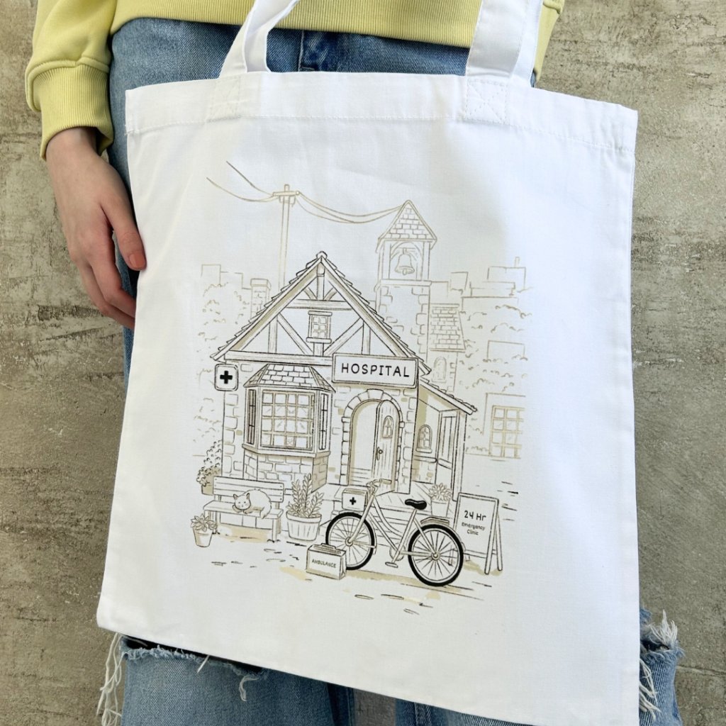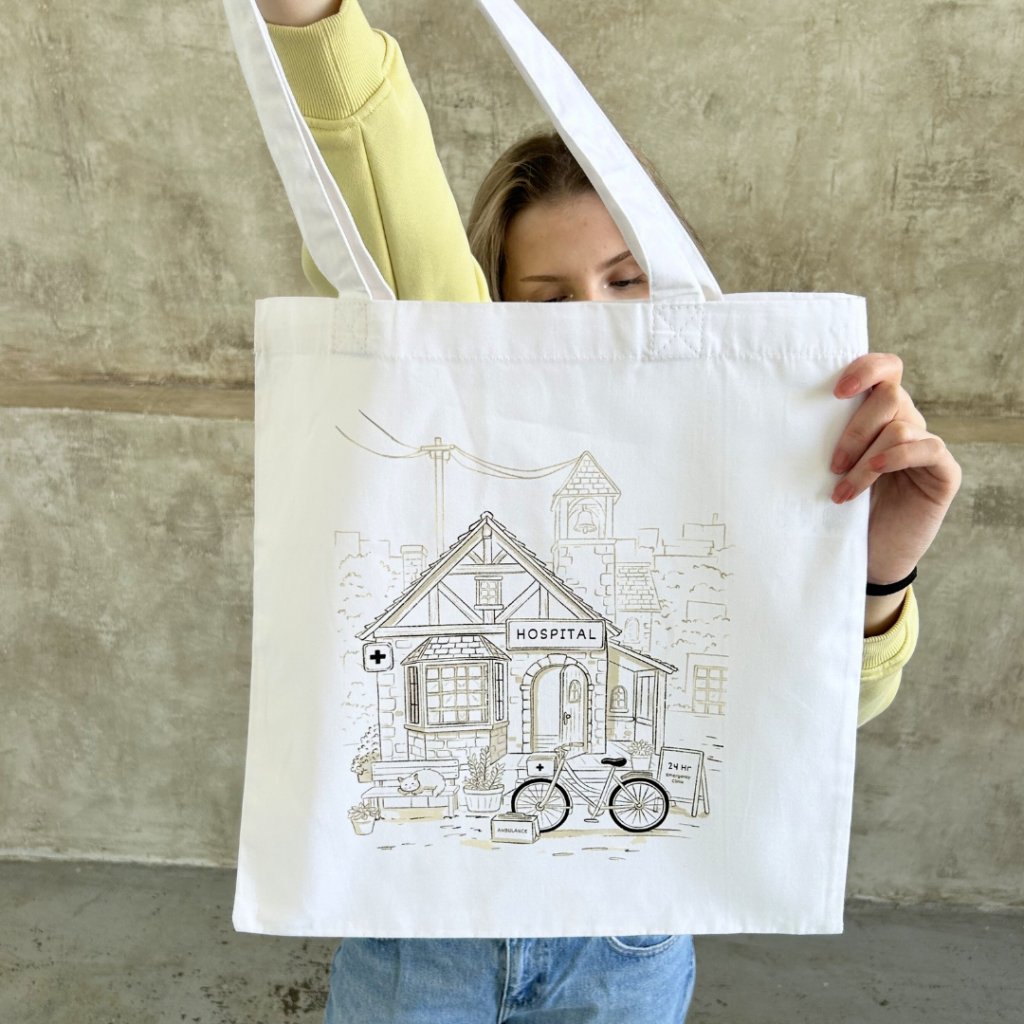 Plátěná taška Hospital v bílé barvě je vyrobená ze 100% bavlny v pevné plátnové vazbě (200 g/m²). Díky křížovému prošití popruhů je odolná a bez problémů unese i těžší učebnice nebo nákup. Svými rozměry (38 × 42 cm) a dlouhými uchy (67 cm) umožňuje pohodlné nošení v ruce i přes rameno. Každý kousek potiskujeme přímo v naší dílně s maximální péčí a láskou.