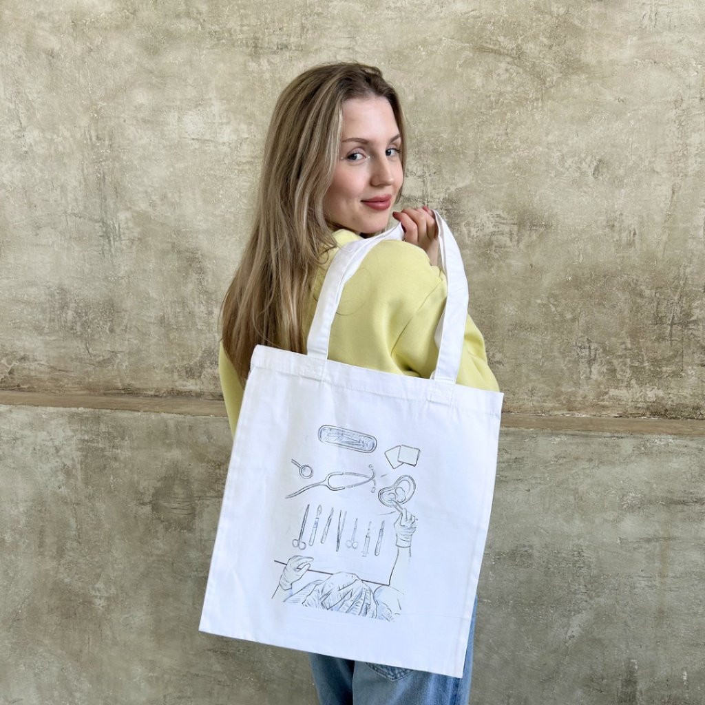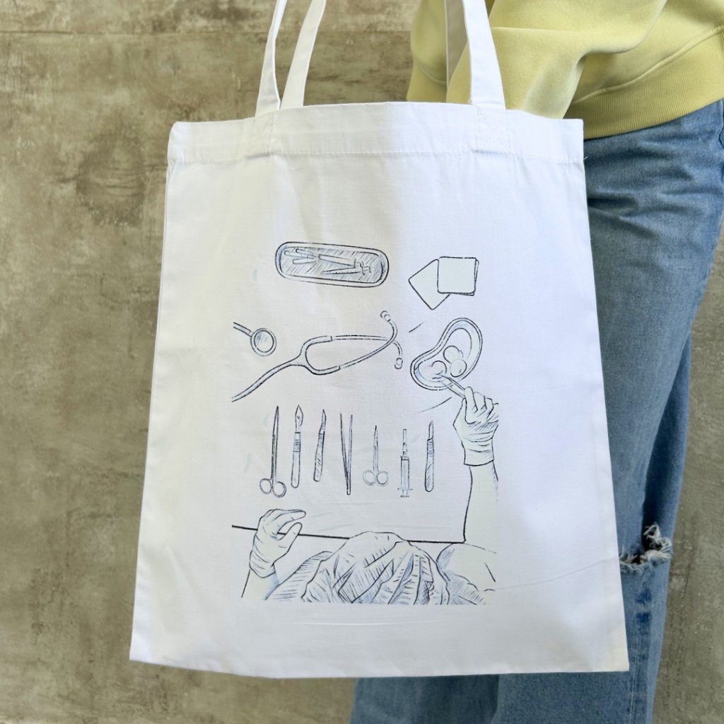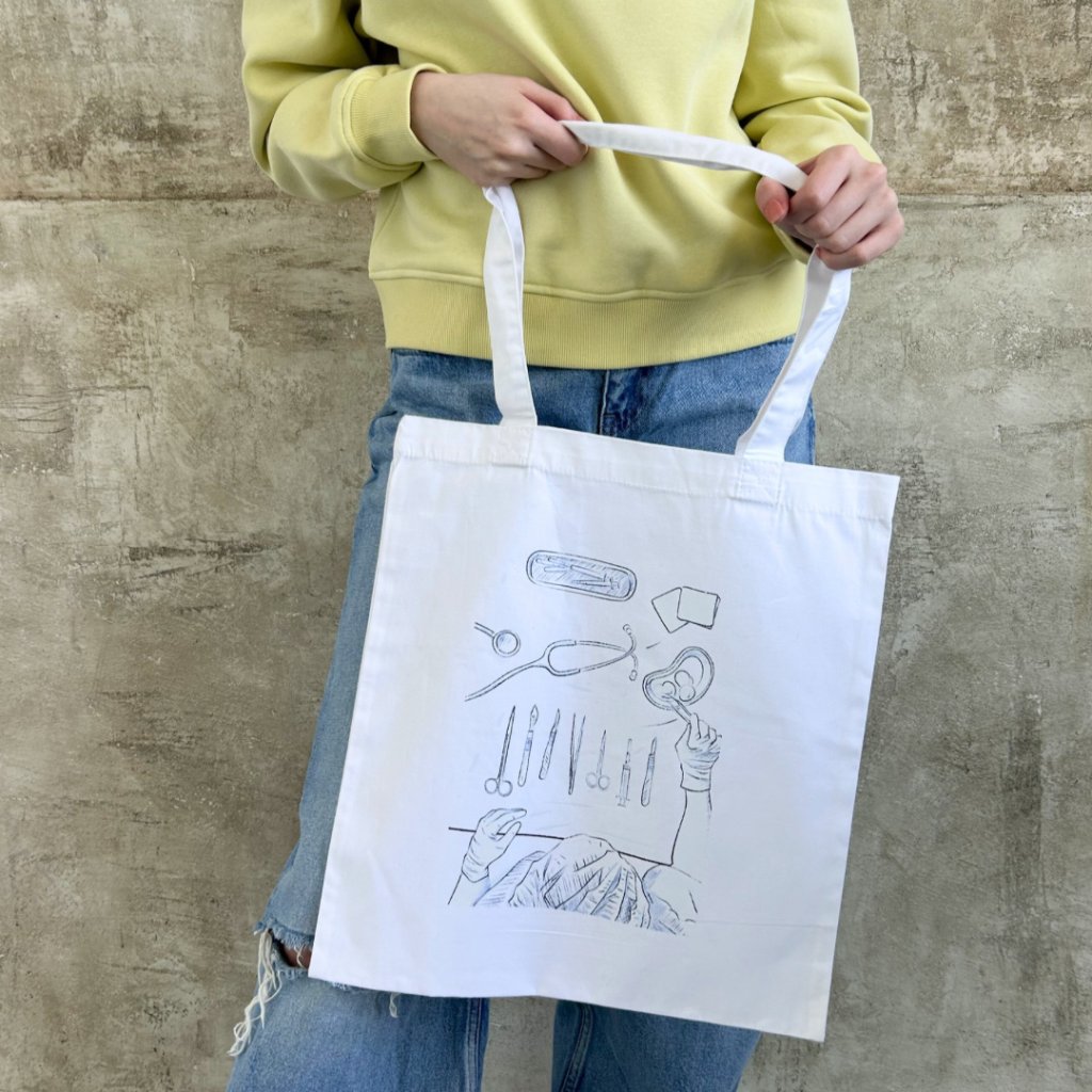 Plátěná taška Surgeon v bílé barvě je vyrobená ze 100% bavlny v pevné plátnové vazbě (200 g/m²). Díky křížovému prošití popruhů je odolná a bez problémů unese i těžší učebnice nebo nákup. Svými rozměry (38 × 42 cm) a dlouhými uchy (67 cm) umožňuje pohodlné nošení v ruce i přes rameno. Každý kousek potiskujeme přímo v naší dílně s maximální péčí a láskou.